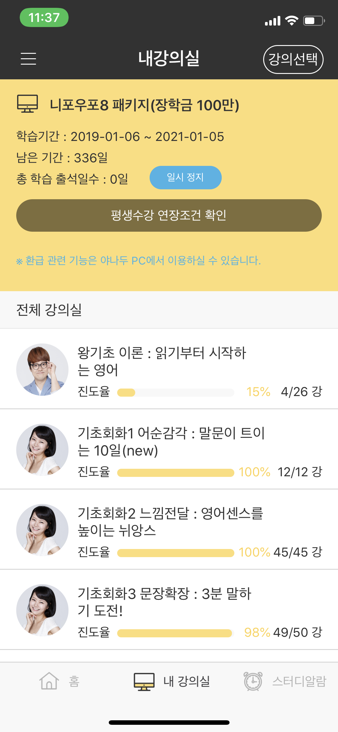 전 야나두 평생회원으로 구매했고 꾸역꾸역 연장 1회 한 상태에요. 평생회원 패키지는 365일 중에 77일 출석하고 한 강의 정도씩만 들어주면 연장되더라구요.
